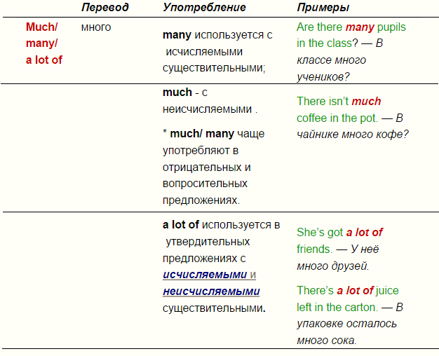 Правила употребления “much”, “many”, “a lot of” с примерами