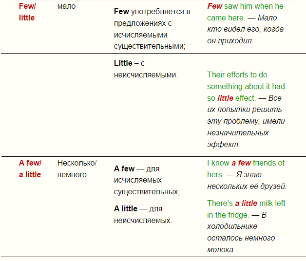 В отличие от much и many, little и few – это два слова, которые используются для отображения значения «мало». Ключевая разница между few и little также строится на понятии исчисляемости. Однако с little и few важную роль играют еще и артикли, от которых также зависят некоторые нюансы.