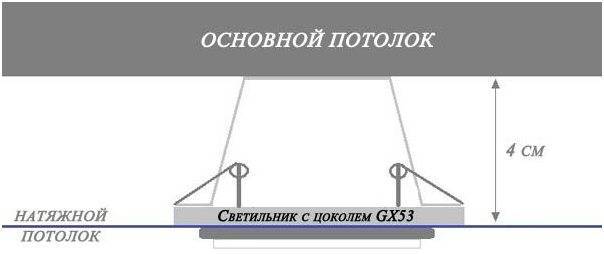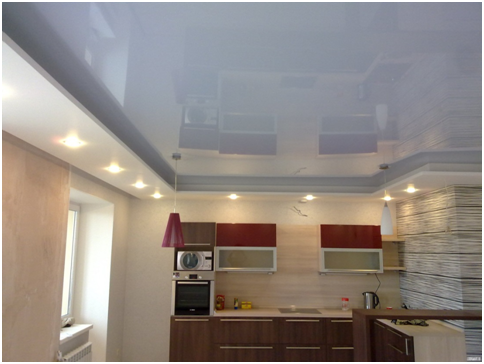 Внешне такие потолки достаточно явно отличаются от подвесного типа, т.к. здесь не монтируется каркас, который занимает некоторое пространство. Полотно крепится в верхней части комнаты на высоте не более 3-4 см, но этого достаточно для сокрытия недостатков поверхности в виде перепадов высоты, и монтажа светильников.