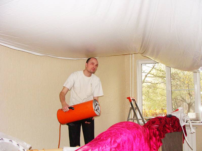 Окончательный этап монтажа потолка включает крепление пленки ПВХ по углам помещения. Полотно должно стать достаточно мягким и эластичным. Чтобы оно хорошо тянулось, его разогревают тепловой пушкой до 60°С, после чего пленку натягивают на профили. Щели, образующиеся между стеной и багетом, закрываются нащельником, который к тому же играет роль декоративного плинтуса. Когда воздух в помещении остывает до комнатной температуры, полотно полностью выпрямляется, а интерьер преображается за счет идеально ровного и гладкого потолка.