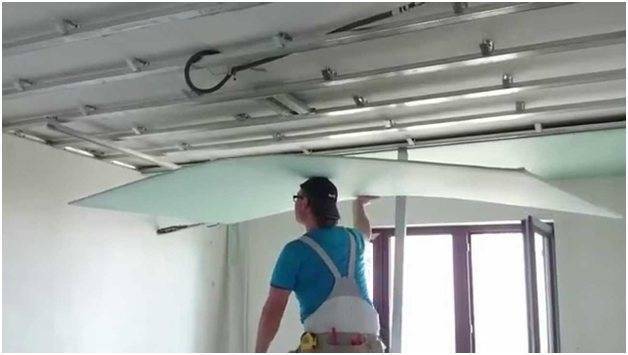 Установка подвесного потолка начинается с разметки всей площади помещения с помощью специального уровня. После этого, строго по разметке, прикрепляются все направляющие профиля, а затем и сам профиль. Для его установки необходимо вставить его в подвес и закрепить специальными саморезами. Листы из гипсокартона закрепляются в шахматном порядке, поэтому следует установить перемычки на определенном расстоянии. Крепеж перемычек к профилю осуществляется при помощи одноуровневых соединителей. Затем готовый каркас обшивается гипсокартоном
