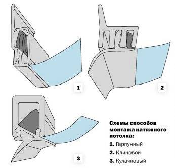 Натяжной потолок — хрупкое изделие, которое закрепляют в профили — багеты, устанавливаемые по периметру комнаты. Фиксируются они следующими способами: