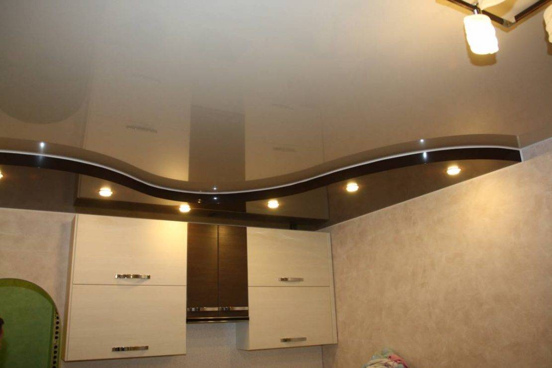 Внешне такие потолки достаточно явно отличаются от подвесного типа, т.к. здесь не монтируется каркас, который занимает некоторое пространство. Полотно крепится в верхней части комнаты на высоте не более 3-4 см, но этого достаточно для сокрытия недостатков поверхности в виде перепадов высоты, и монтажа светильников.