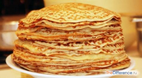 Состав теста Мука, молоко, яйца, масло, соль Мука, молоко, яйца, соль Начинка Разнообразная: масло, сметана, фрукты и пр. Редко используется начинка Размер Больший Меньший Толщина Около 3-5 мм Тонкие, около 1-2 мм