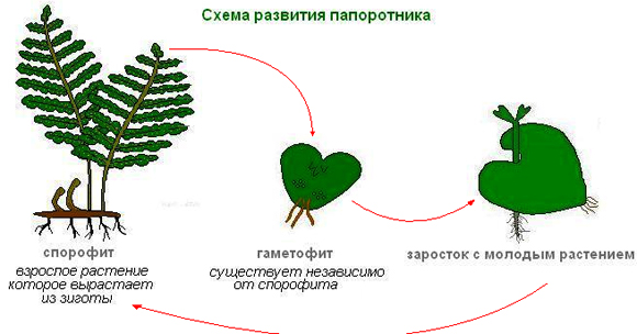 На влажной почве спора прорастает и образует маленькую зеленую пластинку сердцевидной формы. Она раза в два меньше монеты. Это заросток папоротника. Одной стороной он прилегает к почве и укрепляется в ней ризоидами.