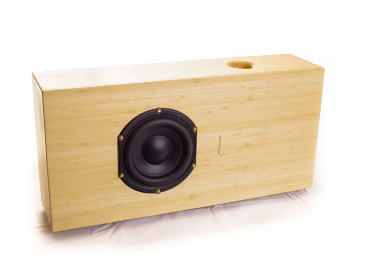 - с корпусом, встроенным динамиком и фазоинвертором (отверстием) для отвода воздуха (в пассивном или актив-сабе);