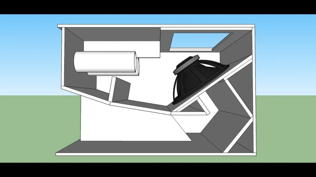- с 2-камерным корпусом bandpass, внутренним встроенным динамиком и отводным отверстием – фазоинвертором (в пассивном или актив-сабе).