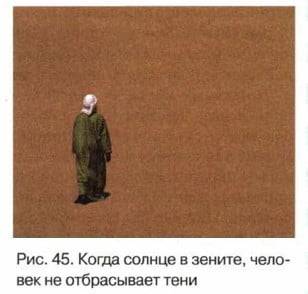 Тропики — эти параллели замечательны тем, что на них в дни солнцестояний в полдень солнце находится в зените, то есть точно над головой (рис. 45).