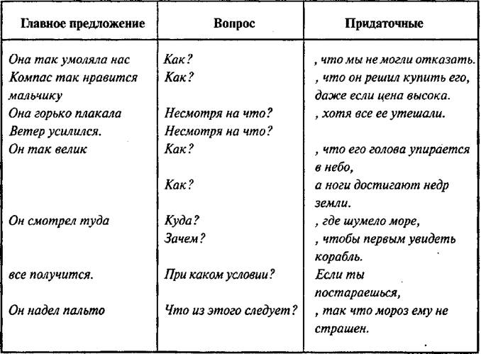 3. Придаточные обстоятельственные имеют те же значения, что и обстоятельства в простом предложении. Отвечают на те же вопросы и делятся на те же виды.