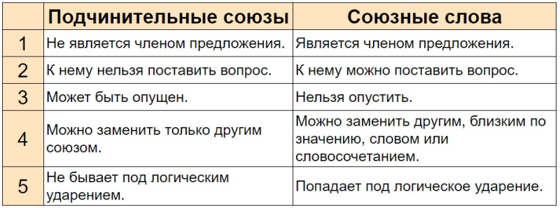 Что касается различий между союзами и союзными словами, они сведены в таблицу.