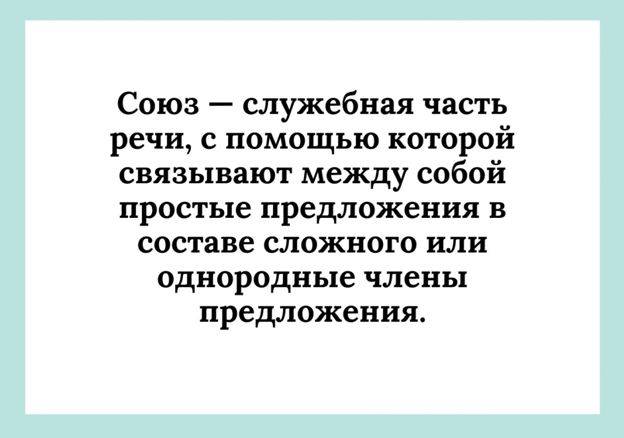 Союз — это служебная часть речи, которая служит для связи частей сложного предложения, однородных членов предложения и целых предложений.