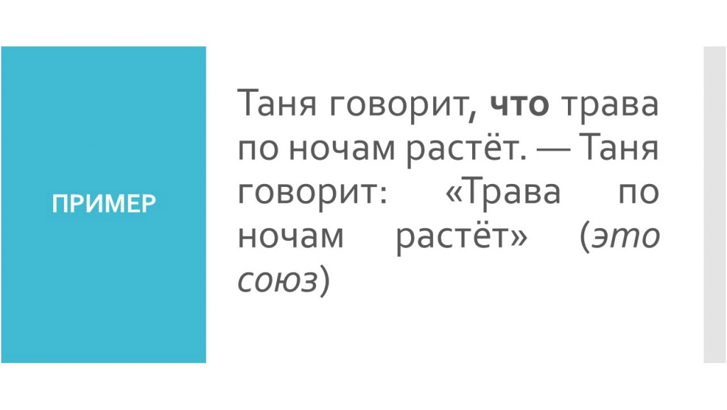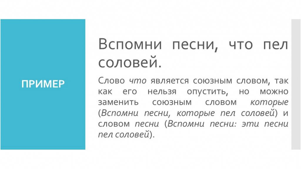 2. Часто (но не всегда! ) союз можно изъять из придаточного предложения, ср. : Он сказал, что сестра не вернётся к ужину. — Он сказал: сестра не вернётся к ужину. 2. Поскольку союзное слово — член придаточного предложения, его нельзя изъять без изменения смысла: Она не сводила глаз с дороги, что ведёт через рощу; невозможно: Она не сводила глаз с дороги, ведёт через рощу.