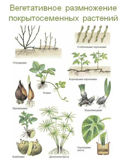Для покрытосеменных растений характерно и бесполое или вегетативное размножение. В этом случае новый организм формируется из части какого-либо органа взрослой особи, например листа, стебля, корневища. Оба эти типа размножения способствовали быстрому распространению представителей отдела покрытосеменные.