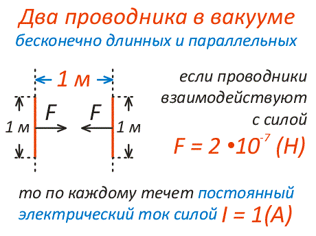 Если проводники взаимодействуют с силой \(\large 2 \cdot 10^{-7} \) Ньютона, приходящейся на каждый метр их длины, то по каждому из них течет постоянный ток 1 Ампер.