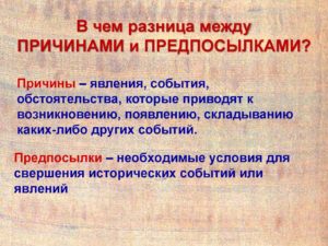 Разобраться, в чем разница между предпосылками и причинами, поможет и такой пример. Родители Петра были юристами, и это являлось предпосылкой для того, чтобы сын пошёл по их стопам.