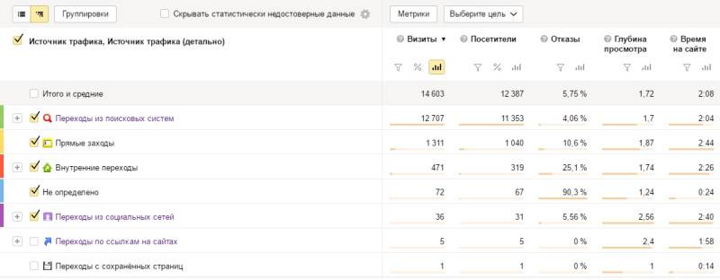 На странице Отчеты — Стандартные отчеты — Источники — Источники, сводка можно найти расклад по всем источникам трафика.