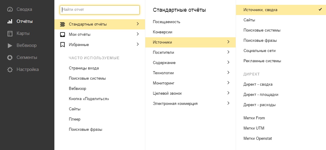 На странице Отчеты — Стандартные отчеты — Источники — Источники, сводка можно найти расклад по всем источникам трафика.