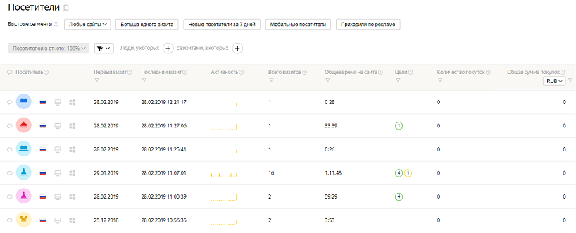 - Быстрые сегменты. Фильтрация визитов посетителей сайта по подготовленным параметрам.