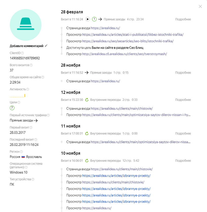 - достигнутые цели и данные Ecommerce (если настроено) в рамках визита;