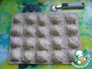 Залепила края, разрезала на равиоли резцом с зубчиками, выдавливая по возможности воздух.