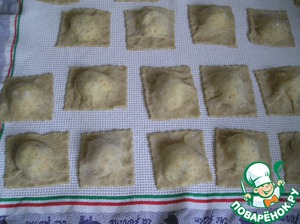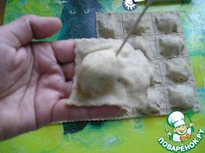 Формируем равиоли с мясом так же, как приведено в классическом рецепте. Начинку выкладываем ложкой.