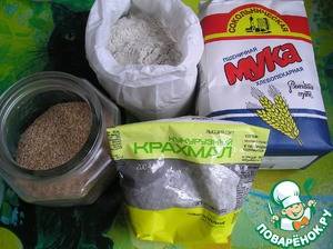 Вот продукты, которыя я использую для приготовления теста. Здесь мука пшеничная, мука ржаная, цельносмолотая, отруби и кукурузный крахмал. Кроме этого нужно добавить соль и сливочное масло.