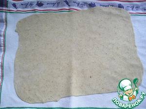 Раскатала второй пласт, разложила начинку. Сегодня у меня творог с зеленью, а так могут быть и грибы с луком и ветчиной и любая другая начинка. Тесто получается само по себе очень вкусным и прекрасно гармонирует с начинкой типа картошки с луком, или грибов.