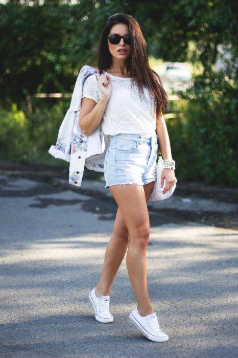Современные девушки-подростки комбинируют джинсовые шорты с кроссовками