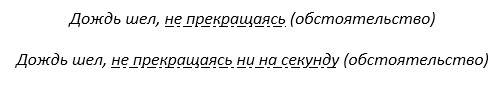 | Начальная форма — неопределённая форма глагола. Постоянные признаки: неизменяемая форма, совершенный и несовершенный вид, переходность*, возвратность*. * В ряде школьных программ признаки переходности и возвратности не рассматриваются. | Обстоятельство. |