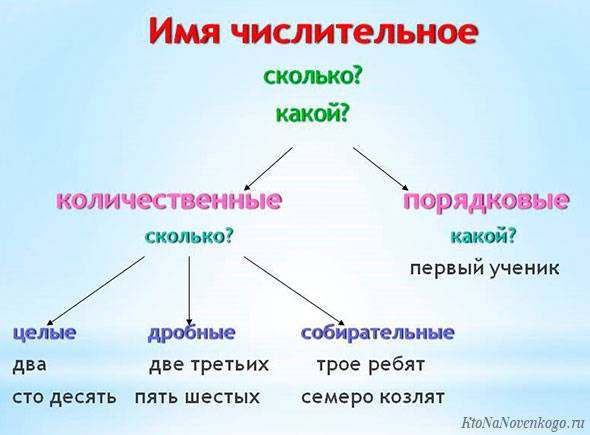| Начальная форма — именительный падеж. Постоянные признаки: простое или составное, количественное или порядковое, целое, дробное или собирательное. Непостоянные признаки: падеж, число (если есть), род (если есть) | Количественные — любой член предложения. Порядковые — определение, именная часть составного сказуемого. |