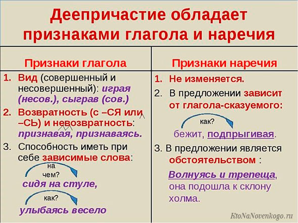 Деепричастие также относится к самостоятельным частям речи, хотя некоторые лингвисты считают его лишь определенной формой глагола. Отвечает на вопросы «Что делая?» и «Что сделав?»