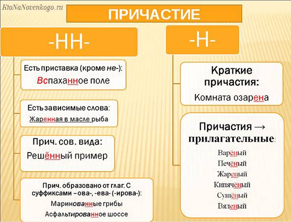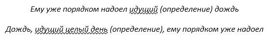 | Начальная форма — именительный падеж, единственное число, мужской род. Постоянные признаки: действительное или страдательное, время, вид. Непостоянные признаки: полная или краткая форма (у страдательных), падеж (в полной форме), число, род. | Определение. Краткие страдательные — именная часть составного сказуемого. |