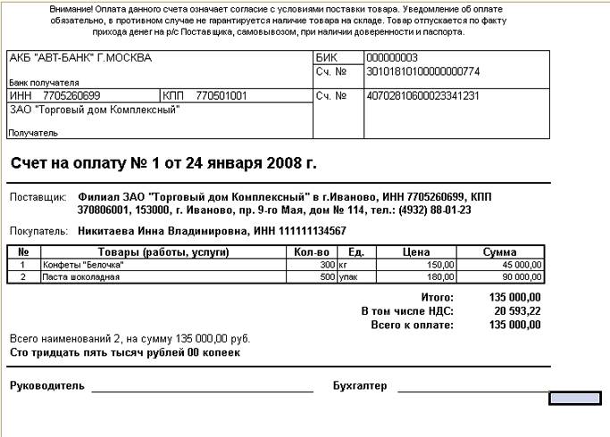 Однако подобный счет обладает важной функцией, влияющей на установление полноценных деловых взаимоотношений партнеров. Он выступает предложением о заключении сделки в том случае, когда договора как отдельного документа, определяющего права и обязанности сторон хозяйственной операции еще не существует