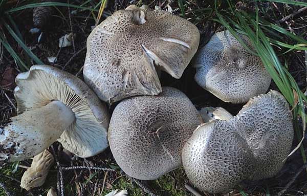 Конической формы, по мере роста меняется на плоскую с выступающим бугорком Серо-коричневого цвета Диаметр 15 см | Белая или розоватая Плотная Высота — 10 см Ширина— 2 см Расширена у основания | Редкие Неровные Белого или сероватого тона | Легкий мучнистый | Жесткая Волокнистая Безвкусная | Рядом с сосной: на европейской территории России, в Сибири, на Кавказе |