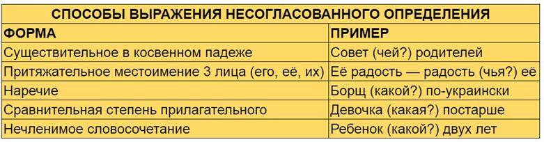 Чаще всего они могут быть выражены именем существительным с предлогом и без предлога и иметь разные значения. Способы выражения несогласованного определения, примеры: