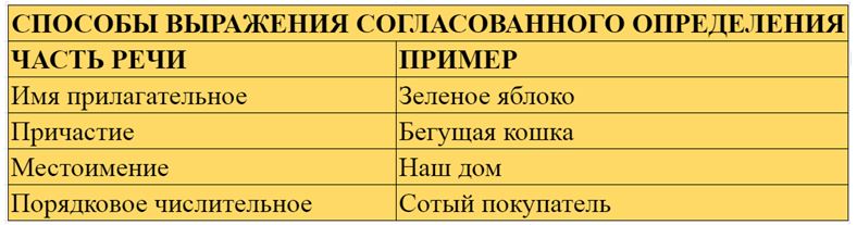 Согласованное определение выражается несколькими частями речи, чаще всего прилагательным. Рассмотрим таблицу.