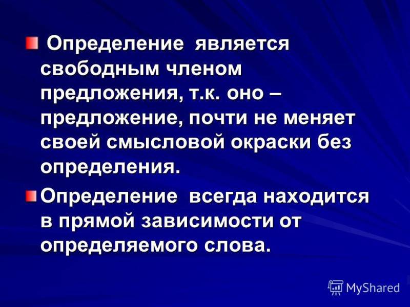 Определение является свободным членом предложения, т.к. оно – предложение, почти не меняет своей смысловой окраски без определения. Определение является свободным членом предложения, т.к. оно – предложение, почти не меняет своей смысловой окраски без определения. Определение всегда находится в прямой зависимости от определяемого слова.