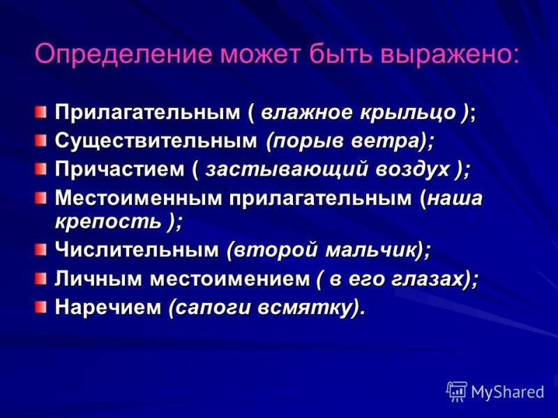 Чаще всего определение выражается с помощью прилагательного, но не исключено использование и других частей речи.