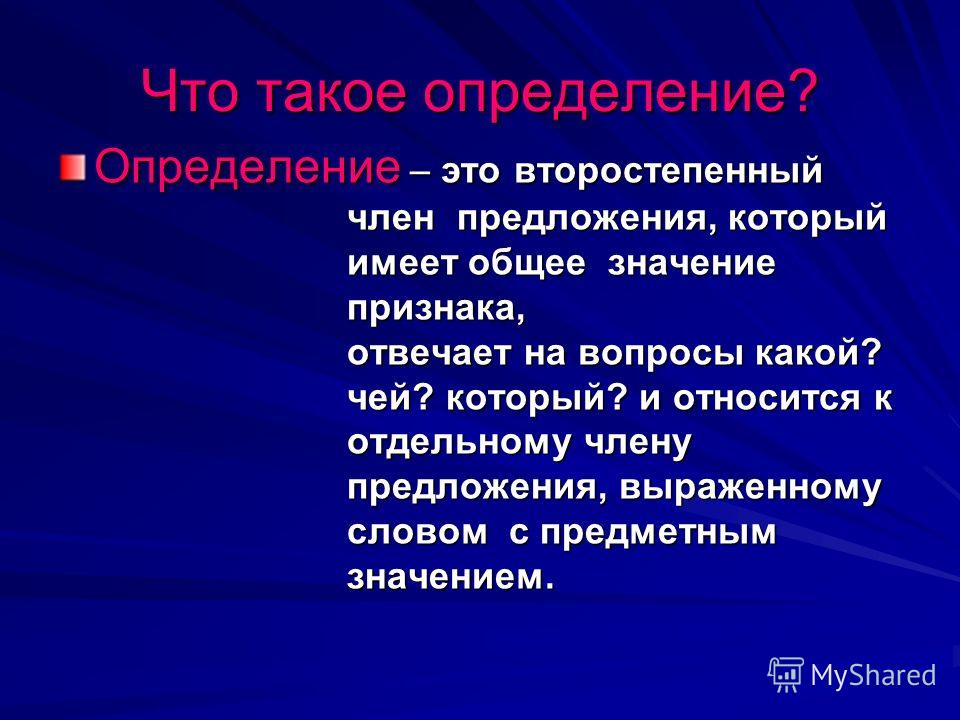 Что такое определение? Определение – это второстепенный член предложения, который член предложения, который имеет общее значение имеет общее значение признака, признака, отвечает на вопросы какой? отвечает на вопросы какой? чей? который? и относится к чей? который? и относится к отдельному члену отдельному члену предложения, выраженному предложения, выраженному словом с предметным словом с предметным значением. значением.