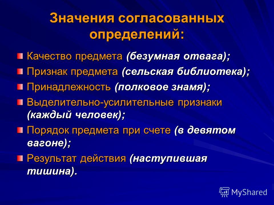 Второстепенный член предложения, к которому можно поставить вопросы какой? какая? какое? какие? чей?, называется определением. Они бывают согласованными и несогласованными. Согласованные употребляются в том же роде, числе и падеже, как и определяемые ими слова: За пустым столиком сидела маленькая девочка и ела мороженое.Примеры согласованных определений, которые могут быть выражены: