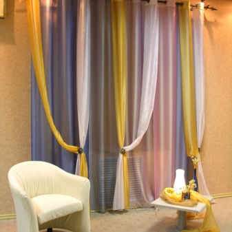 - завязки ‒ вверху занавески находятся текстильные ленты, при помощи которых полотно крепится к карнизу (можно использовать для этого простые узлы или декоративные ‒ в форме банта);