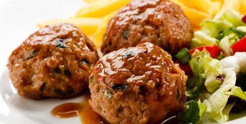 Самое популярное и любимое изделие из мясного фарша – котлеты. Это продолговатые довольно толстые лепешки, толщиной около 1,5 см. Обычно 1 котлета весит около 60 граммов. Котлеты могут подаваться как в соусе, так и просто так. Фарш может быть приготовлен из говядины, свинины, курицы, индейки и различных комбинаций этих видов мяса.