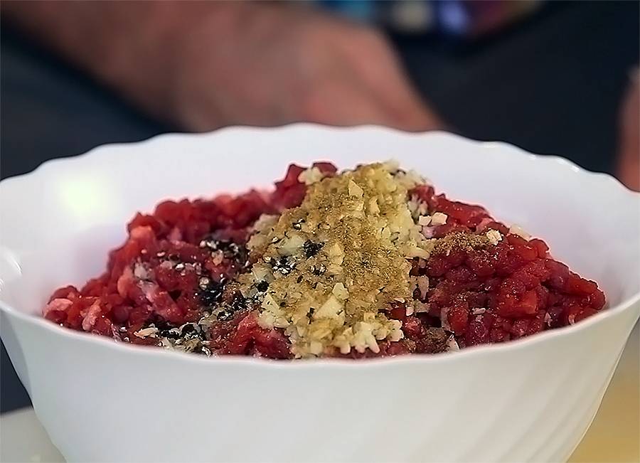 Придумавший этот рецепт шеф-повар, рекомендует для шариков использовать свиной фарш, полученный вручную. Его, в количестве 600 грамм нужно перемешать со 100 граммами риса, отваренного до полуготовности.