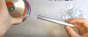 ![]() | На алюминиевую трубку надеваем диски и прокладки поочерёдно. |