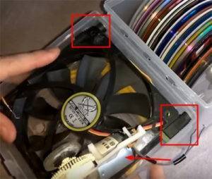 ![]() | Приклеиваем элементы питания, крепим двигатель к наращённой стенке кулера, после чего соединяем контакты моторчика и кулера с установленными гнёздами. |