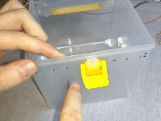 ![]() | При помощи клея «Момент» крепим скобы к контейнеру изнутри, после чего помещаем в них нашу конструкцию (проверяем способность удерживать). |