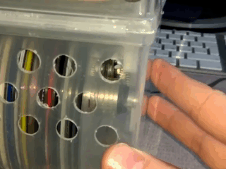 ![]() | Заливаем воду в ёмкость и помещаем моторчик между стенкой и барабаном с дисками так, чтобы у двигателя была возможность крутить конструкцию. |