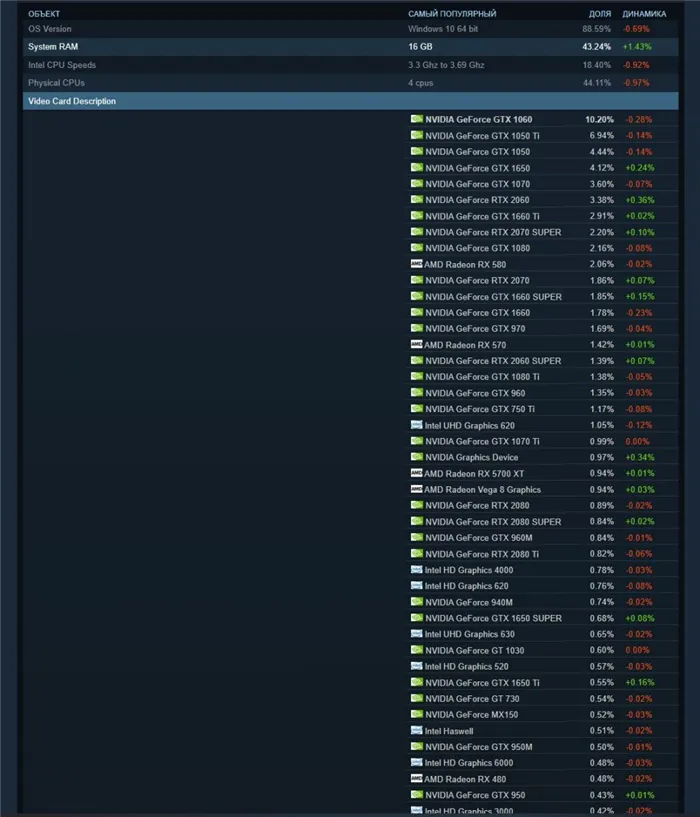 Десятая серия оказалась настолько успешной, что остается лидером по количеству пользователей даже спустя 4 года после выхода. Согласно статистике Steam, GTX 1060 занимает 10% рынка: