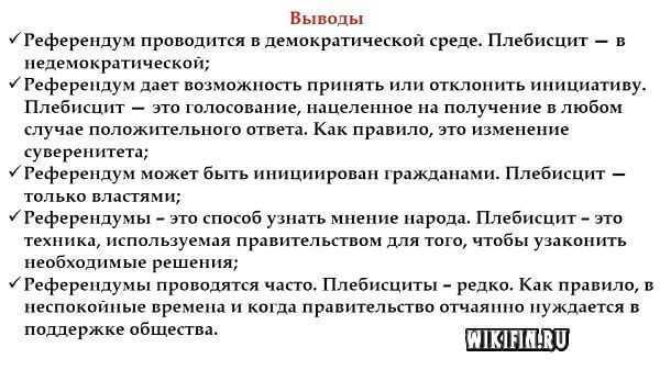 Из определений можно сделать вывод, что плебисцит и референдум — это способы проявления демократии гражданами государства. Понятия схожи с собой, поэтому часто граждане не видят в них весомой разницы. Первая форма проводится только в случае возникновения отдельных вопросов, касающихся территории и законов государства. Для решения более глобальных вопросов проводится вторая.