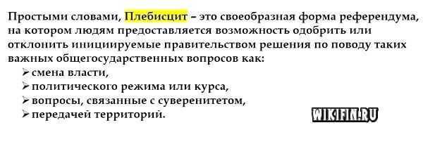 Если трактовать плебисцит простыми словами, то можно сделать вывод, что это один из вариантов проведения опроса. Здесь гражданам государства дается возможность одобрить или опровергнуть предложения, выдвинутые правительством. При проведении данной процедуры могут решаться такие вопросы, как смена власти, полит. режима или передачи отдельной территории другому правительству.